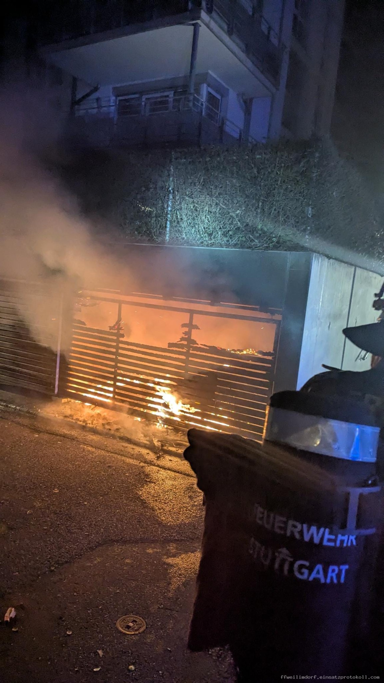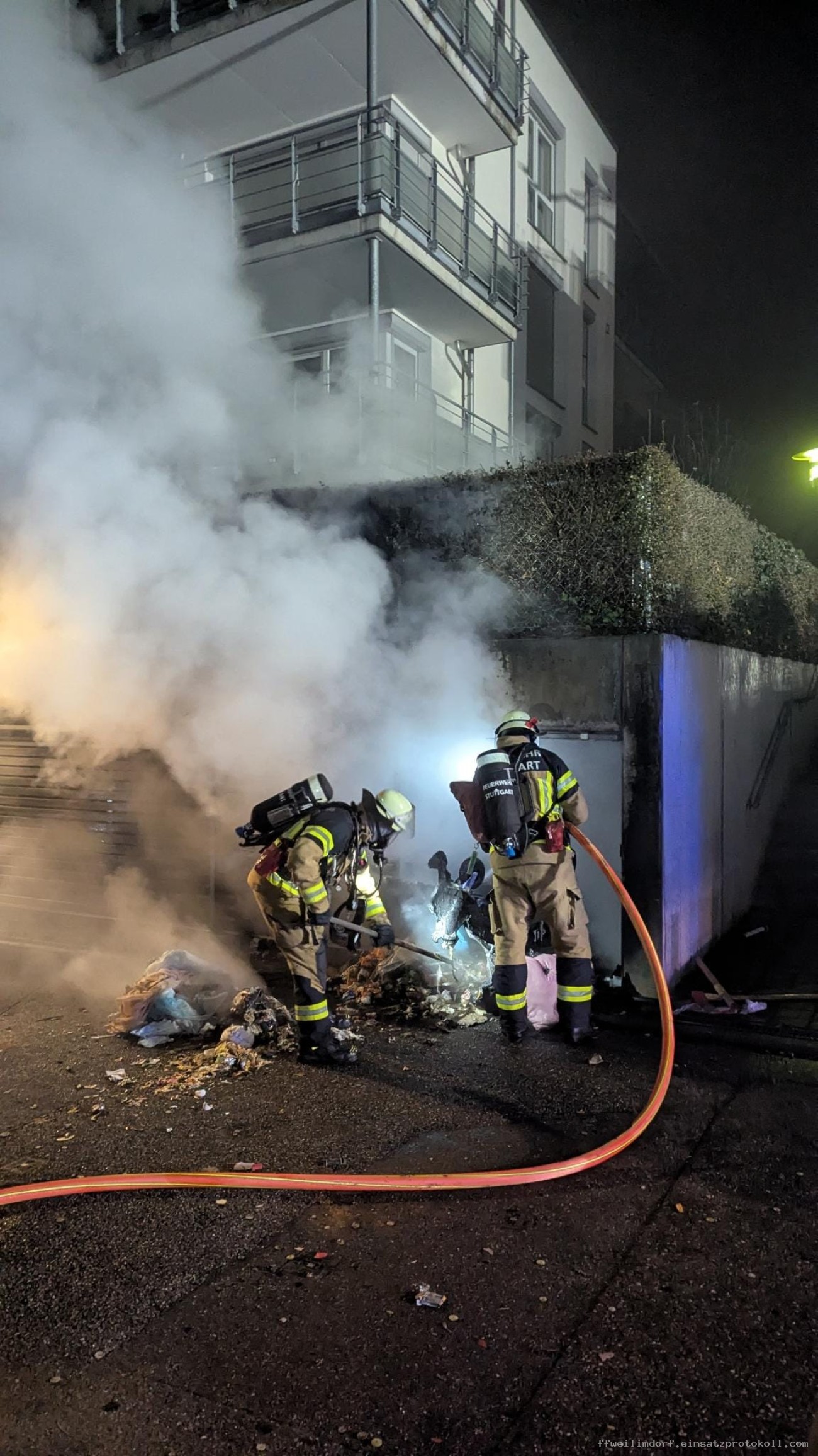 [si] Auf der Rückfahrt vom vorangegangenen Einsatz meldete die Leitstelle einen weiteren Brand in Hausen. Vor Ort brannten Mülltonnen in einem Unterstand. Durch die Feuerwehr wurde sofort ein Rohr unter Atemschutz vorgenommen. Ein Übergreifen auf den benachbarten Müll-Unterstand konnte verhindert werden. Unter Atemschutz wurde der Müll aus dem Unterstand geholt und abgelöscht. Mit der Wärmebildkamera konnten alle Glutnester abgelöscht werden. Nach gut einer Stunde konnte der Einsatz beendet werden und die Einsatzbereitschaft wieder hergestellt werden.