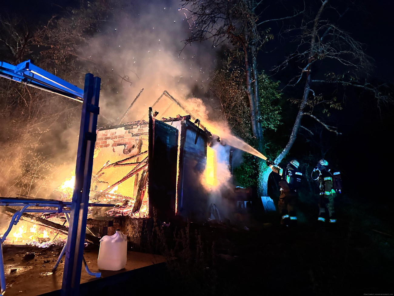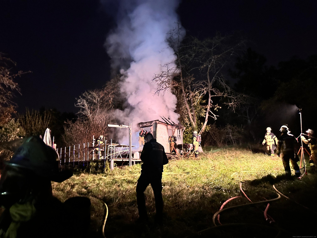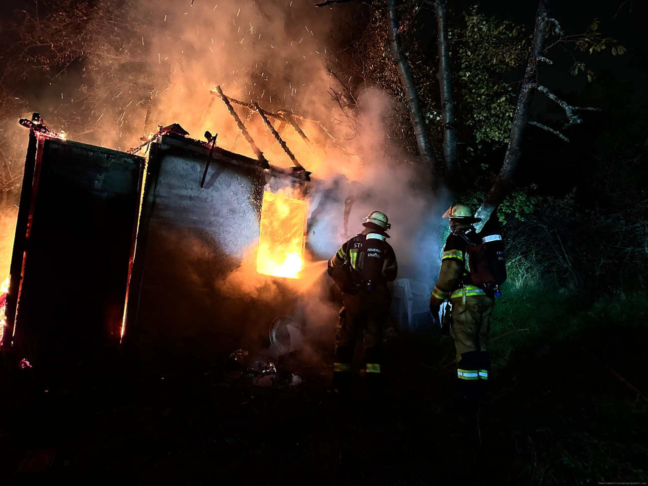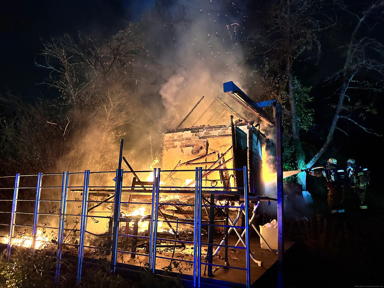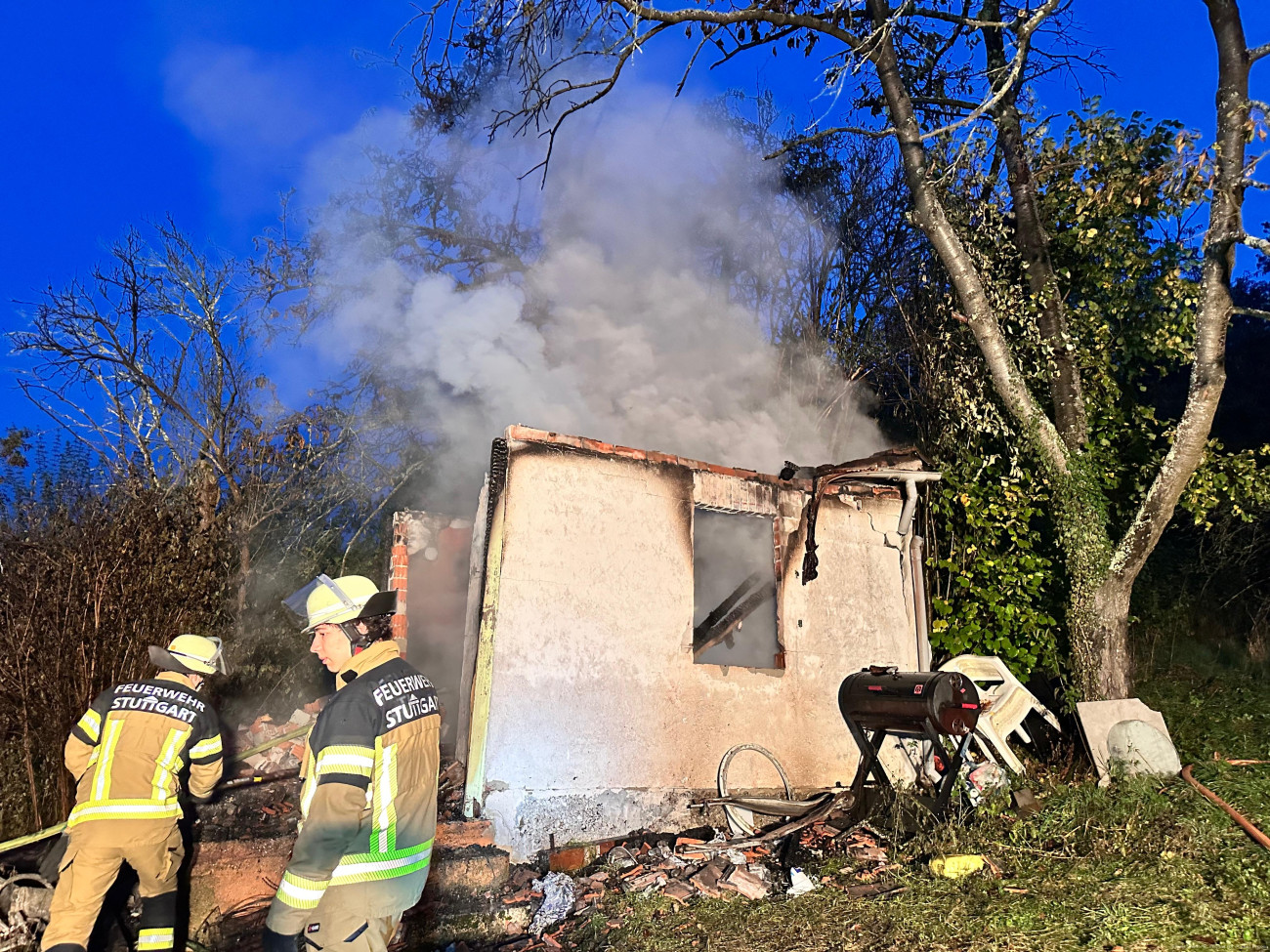 [si] Mehrere Anrufer meldeten gegen 6:30 Uhr eine Rauchentwicklung im Bereich des Fasanenwalds. Die Leitstelle Stuttgart alarmierte neben der Feuerwehr auch die Polizei. Dank der sichtbaren Rauchentwicklung und präziser Richtungsangaben konnte die Einsatzstelle schnell lokalisiert werden. Die ersten Einsatzkräfte bereiteten zügig einen Löschangriff vor und nahmen ein erstes Löschrohr vor. Die Flammen konnten rasch gelöscht werden, jedoch zogen sich die aufwendigen Nachlöscharbeiten über fast zwei Stunden hin. Dabei mussten auch Teile der Dach- und Wandkonstruktion eingerissen werden, um verbliebene Glutnester vollständig zu beseitigen.