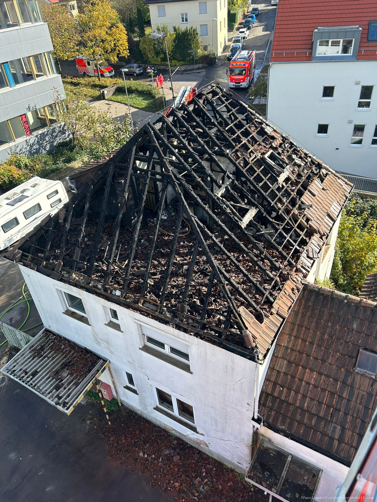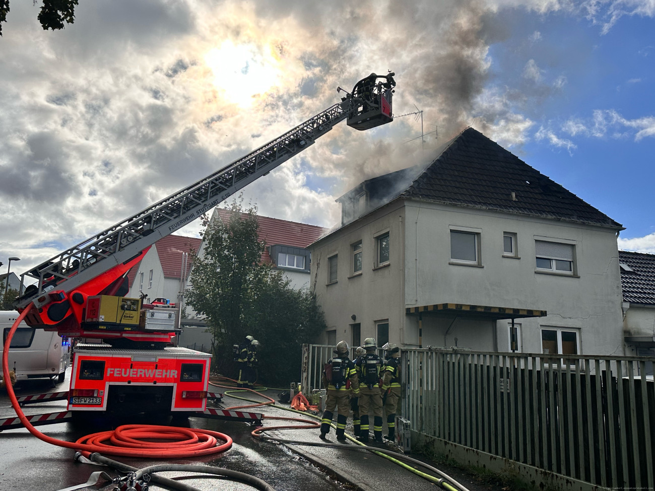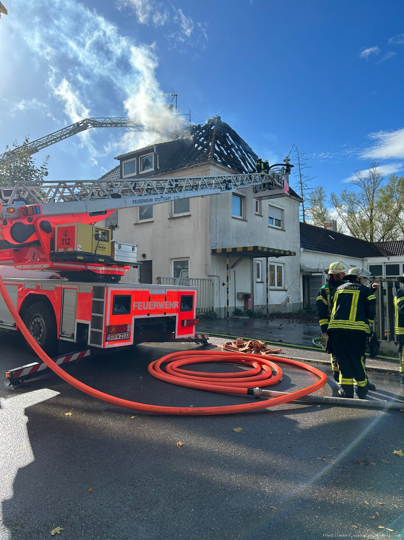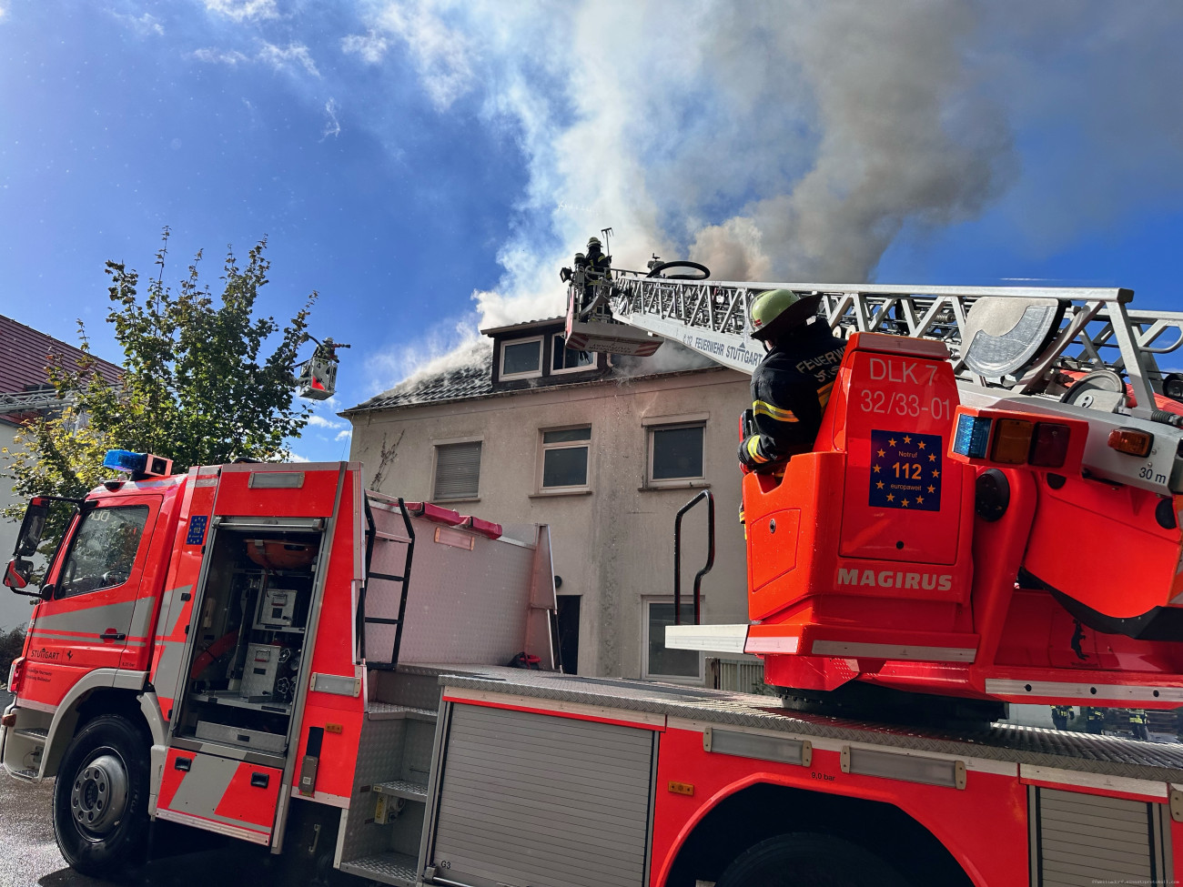 [si] Eine gewaltige Rauchwolke, direkt hinter dem Weilimdorfer Feuerwehrhaus, zeigte am heutigen Freitagmittag der Feuerwehr den Weg zu einem Dachstuhlbrand in die Weilimdorfer Roßbachstraße. Alarmiert durch die Integrierte Leitstelle machten sich neben der Freiwilligen Feuerwehr Weilimdorf auch der Löschzug der Feuerwache 4 aus Feuerbach und ein weiteres Löschfahrzeug der Feuerwache 2 West der Berufsfeuerwehr auf den Weg zu dem in Brand stehenden Haus in der Roßbachstraße. Anfangs stark durch den vom Wind aufpeitschenden Rauch des Mittlerweile in Vollbrand stehenden Dachstuhl ging umgehend ein Atemschutztrupp der Weilimdorfer Feuerwehr in das Gebäude vor und suchte dieses nach Personen ab. Parallel wurde die Drehleiter in Stellung gebracht und ein Löschangriff über diese vorbereitet. Auch von der eintreffenden Berufsfeuerwehr wurde die Drehleiter in Stellung gebracht und ein Atemschutztrupp zur Brandbekämpfung eingesetzt. Mit zwei handgeführten Löschrohren und den zwei Drehleitern gelang den Einsatzkräften aus Haupt- und Ehrenamt gemeinsam ein schneller Löscherfolg. Trotzdem musste der ausgebrannte Dachstuhl aufwendig über die Drehleitern und mittels Atemschutztrupps auf weitere Glutnester und schwelende Flammen kontrolliert werden. Nach drei Stunden konnten die Einsatzkräfte ihren Einsatz beenden. Umfangreiche Aufräumarbeiten schlossen sich an den Einsatz an. Die Weilimdorfer Feuerwehr war bei dem Einsatz zur Mittagszeit mit fünf Fahrzeugen und 28 Einsatzkräften im Einsatz.